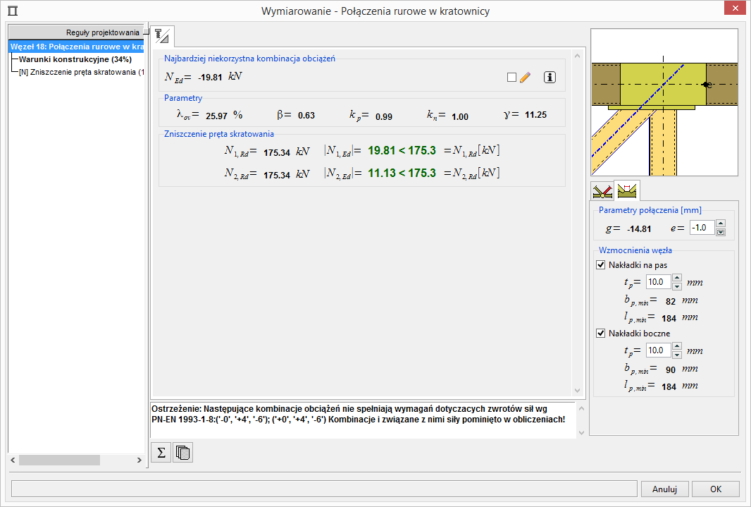 - sprawdzenie następujących warunków projektowych: uplastycznienie pasa, zgniecenie boków pasa, zniszczenie środnika pasa, ścięcie pasa, perforacja, zniszczenie pręta skratowania, wyboczenie miejscowe, nośność węzłów kolankowych i o załamanym pasie,